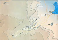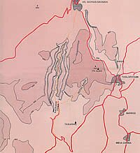 Having passed the difficult spot marked B start ascending again towards the right, after 50 min arriving at the small church called AGIOS GIANNIS (SAINT JOHN) and a fresh water spring. Following the footpath from there on, coming to the village after about 20 min. WARNING : If following the route from ELIDA it is recommended that you choose variation 2 to get to the village. If you follow the bed all the way you might have difficulty at point B. Ancient Roman ruins have been found in ELIDA. These ruins demonstrate the efforts of the Romans to link the WEST COAST of the island to the rest of GREECE. The name ELIDA or ALIDA comes from the word "als" - sea, "alios" - of the sea or from "eleous" - Eleounda.
