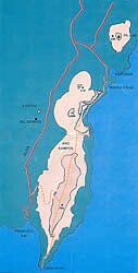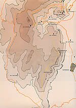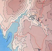 ANAVATOS, means "difficult to climb". The appropriateness of this name is clearly understood when standing on the summit of a pinnacle of rock accessible only from the north - east side. One can appreciate its significance as a last stronghold during the MASSACRE OF THE PEOPLE OF CHIOS in 1822. Even today the bones of those who died in this struggle for freedom can still be found here. The route suggested has not only natural beauty but also great historical interest. From this precipice many Greeks escaped from the Turks and reached ELIDA BAY, where they were able to embark on PSARIANA sailboats which took them to the neighbouring island of PRARA. Our journey begins from the bridge just before going up to the village, and follows the steam bed. Point A on the map shows how to avoid the waterfall by going it from the right. Extra caution is required at point B, here the bed becomes narrower and sharp rocks are found both on the left and right side. Two parts of the route demand the use of a 10 m. climbing rope while at another two points the descent is quite difficult and a rope would be helpful. Metal rings have been placed in the deepest section of the glen to make the descent much easier. The descent takes about 3 : 30 hours and is only for skilled hikers. The altitude here is 300m.